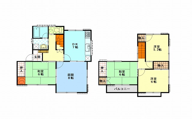 | 間取内容 | 1階DK7畳1室 1階L8畳1室 1階和室6畳1室 2階洋室6畳1室 2階洋室5.2畳1室 2階和室6畳1室 |
